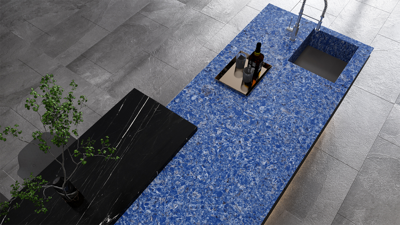 he Gelandy quartz stone GLDS714 is inspired by the world-famous painting "Starry Night" featuring bold and vibrant colors with dynamic and lively patterns. It can be used on kitchen countertops, coffee tables, dining tables, and other surfaces to add a touch of color. Additionally, Gelandy quartz offers advantages such as oil resistance, crack resistance, scratch resistance, acid and alkali resistance, strong weather resistance, easy cleaning, and easy maintenance.