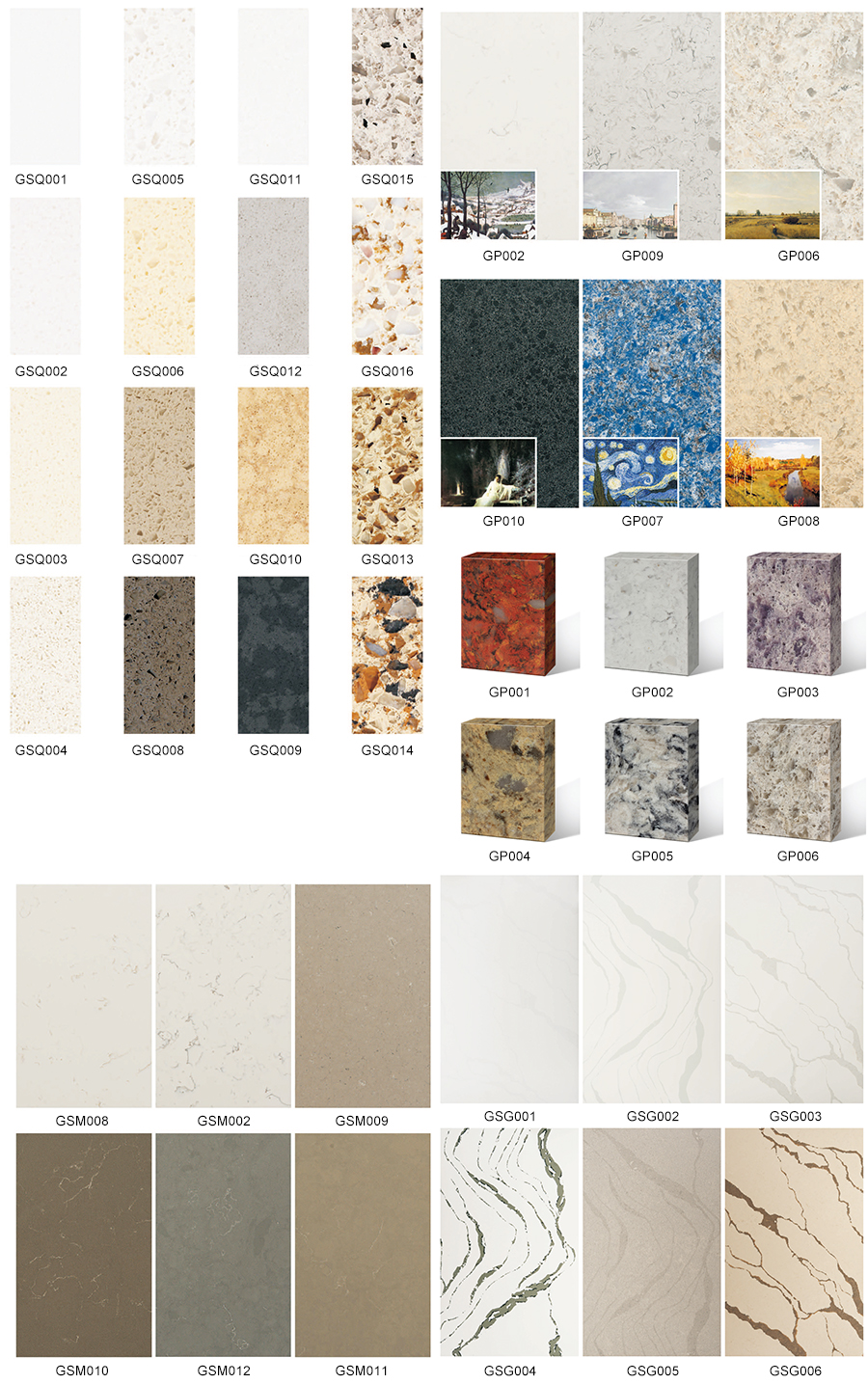 Gelandy carefully select natural quartz crystal mineral,over 99.9% is SiO2 without any harmful radiative heavy metal materials,quartz stone slabs contain over 93 quartz sand