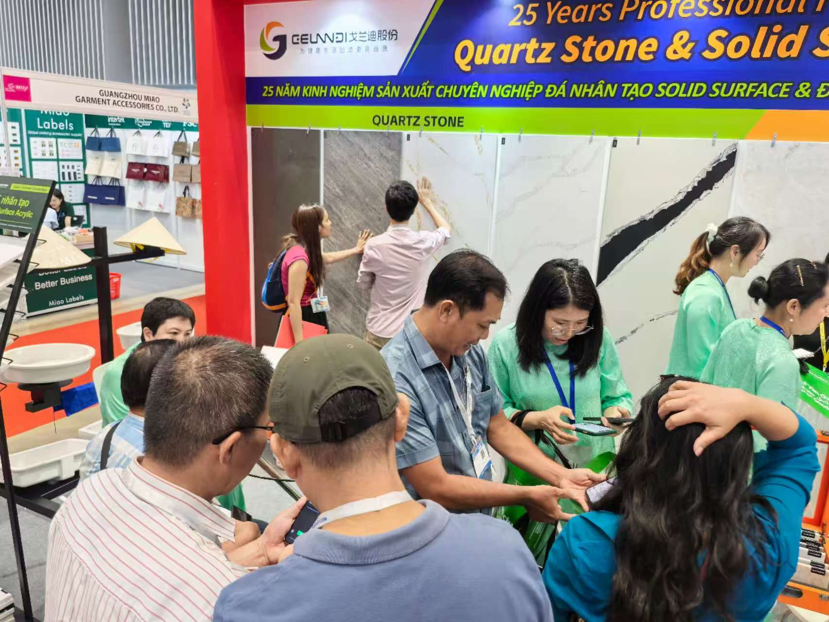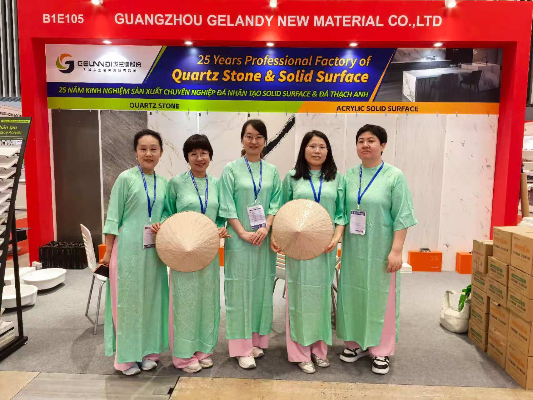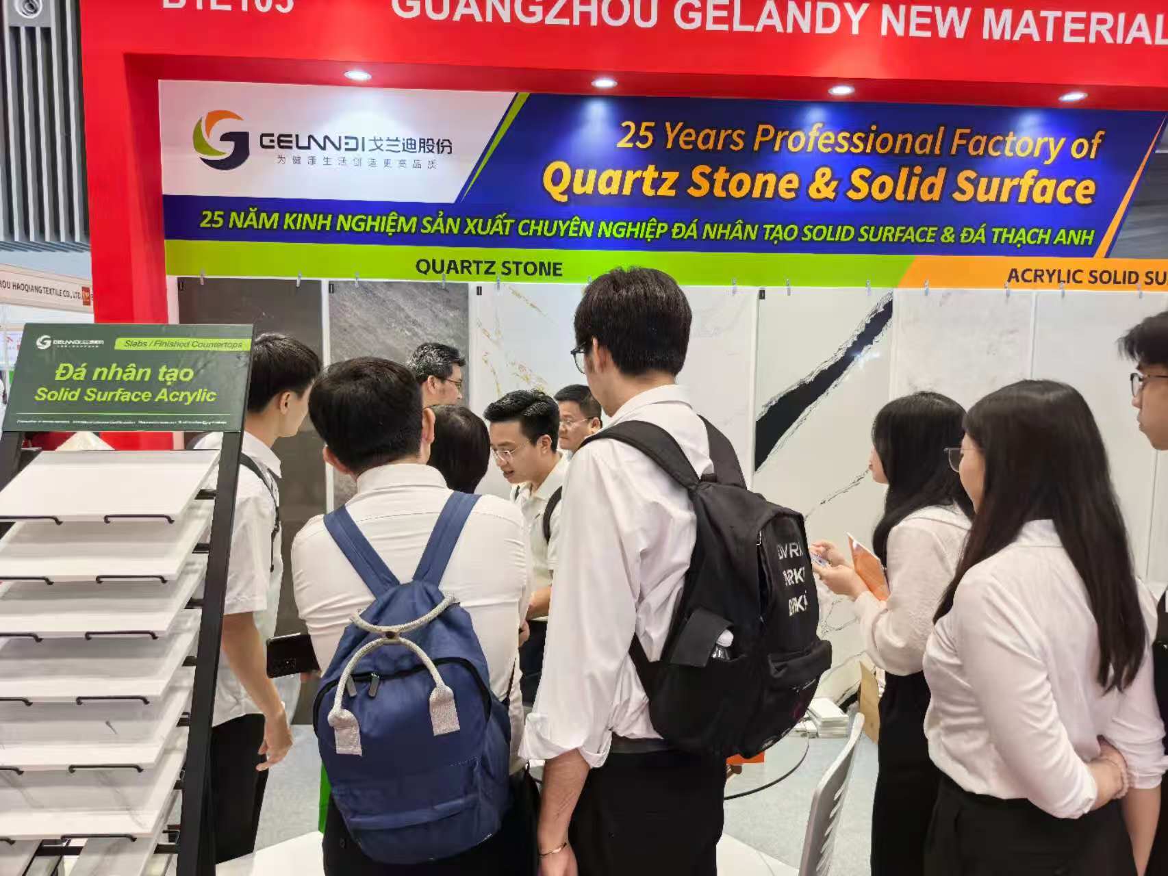 GELANDY is proudly showcasing its latest products at the trade show in Ho Chi Minh City, including solid surface sheets, quartz stone slabs, and solid surface basins.