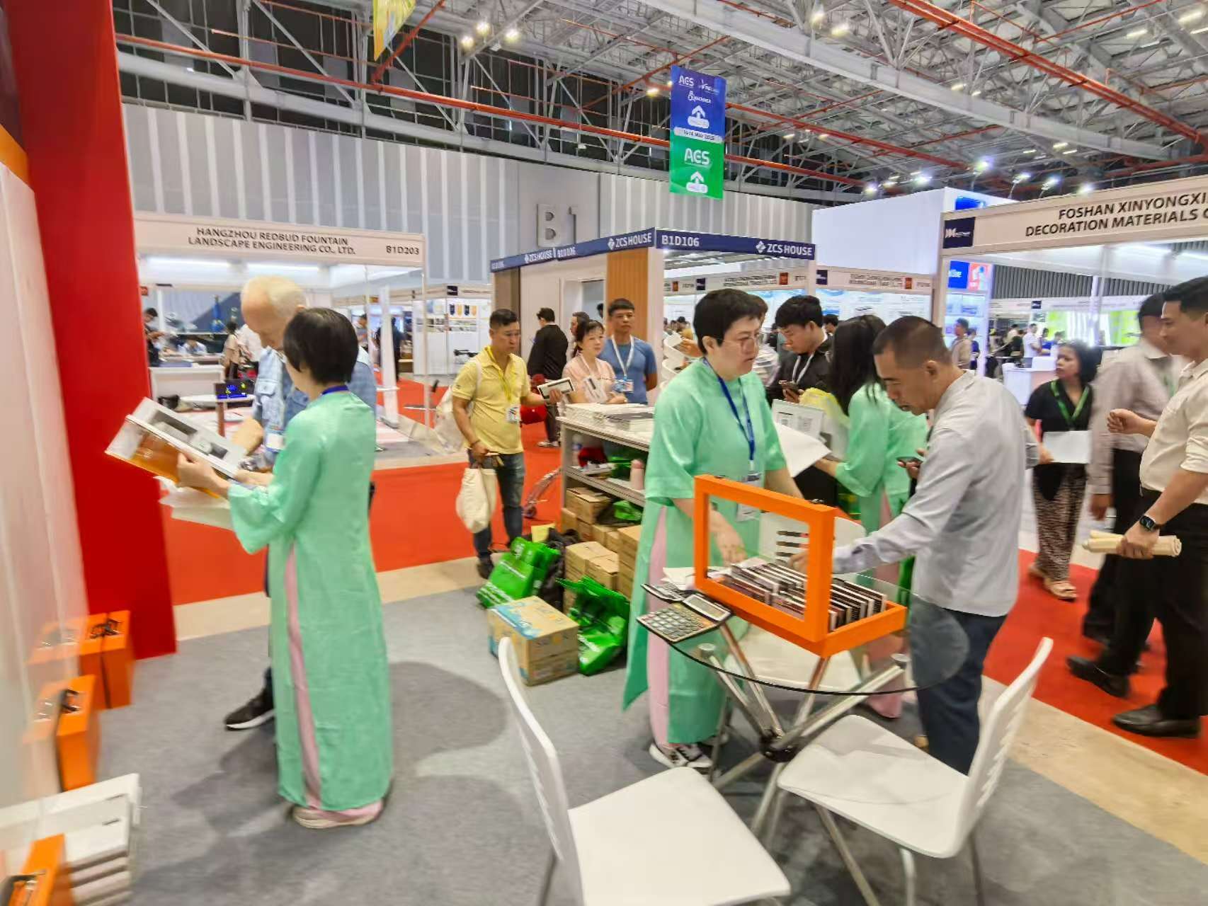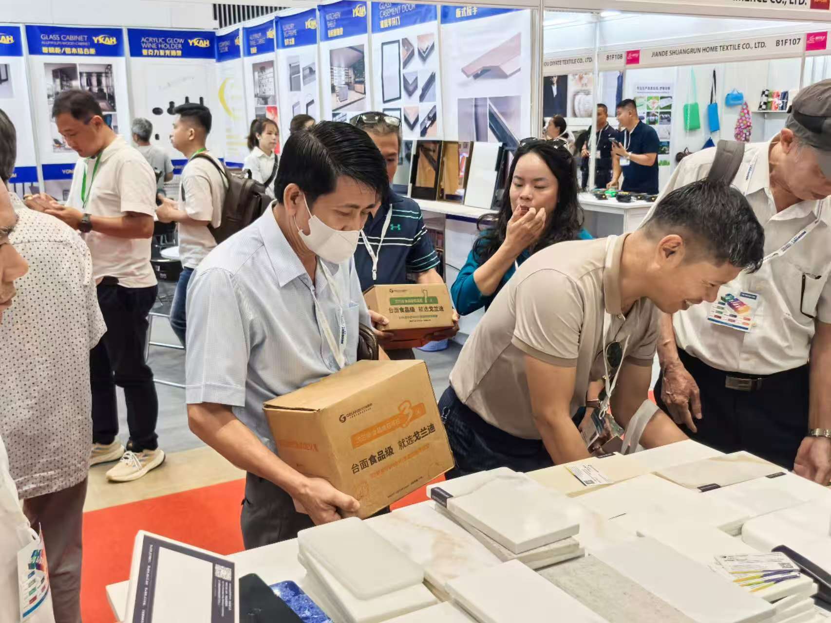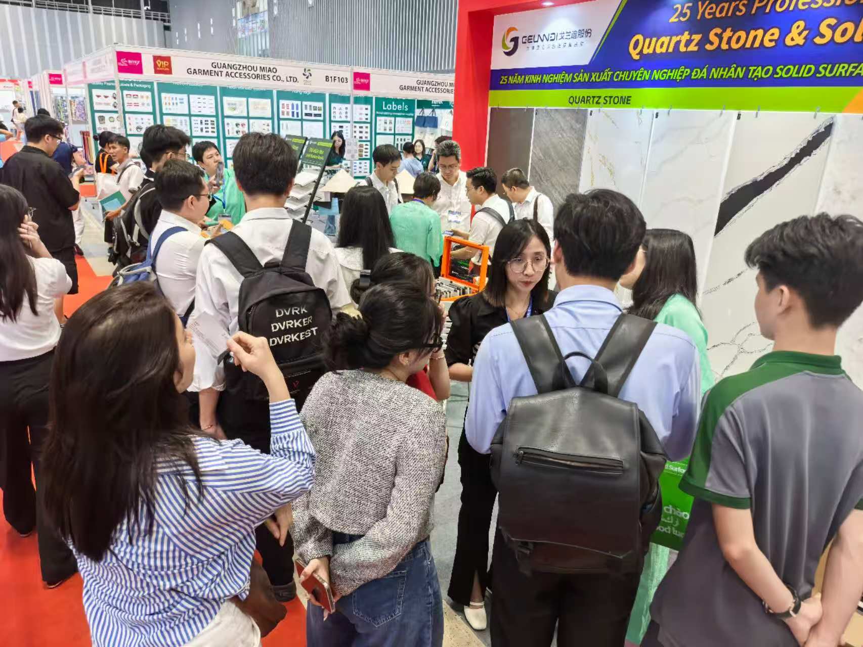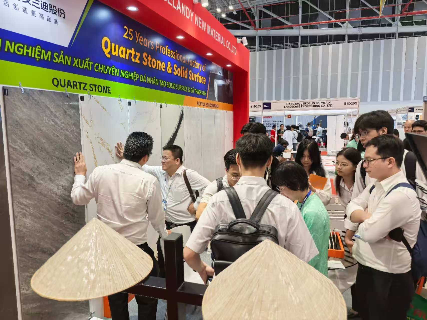 GELANDY is proudly showcasing its latest products at the trade show in Ho Chi Minh City, including solid surface sheets, quartz stone slabs, and solid surface basins.