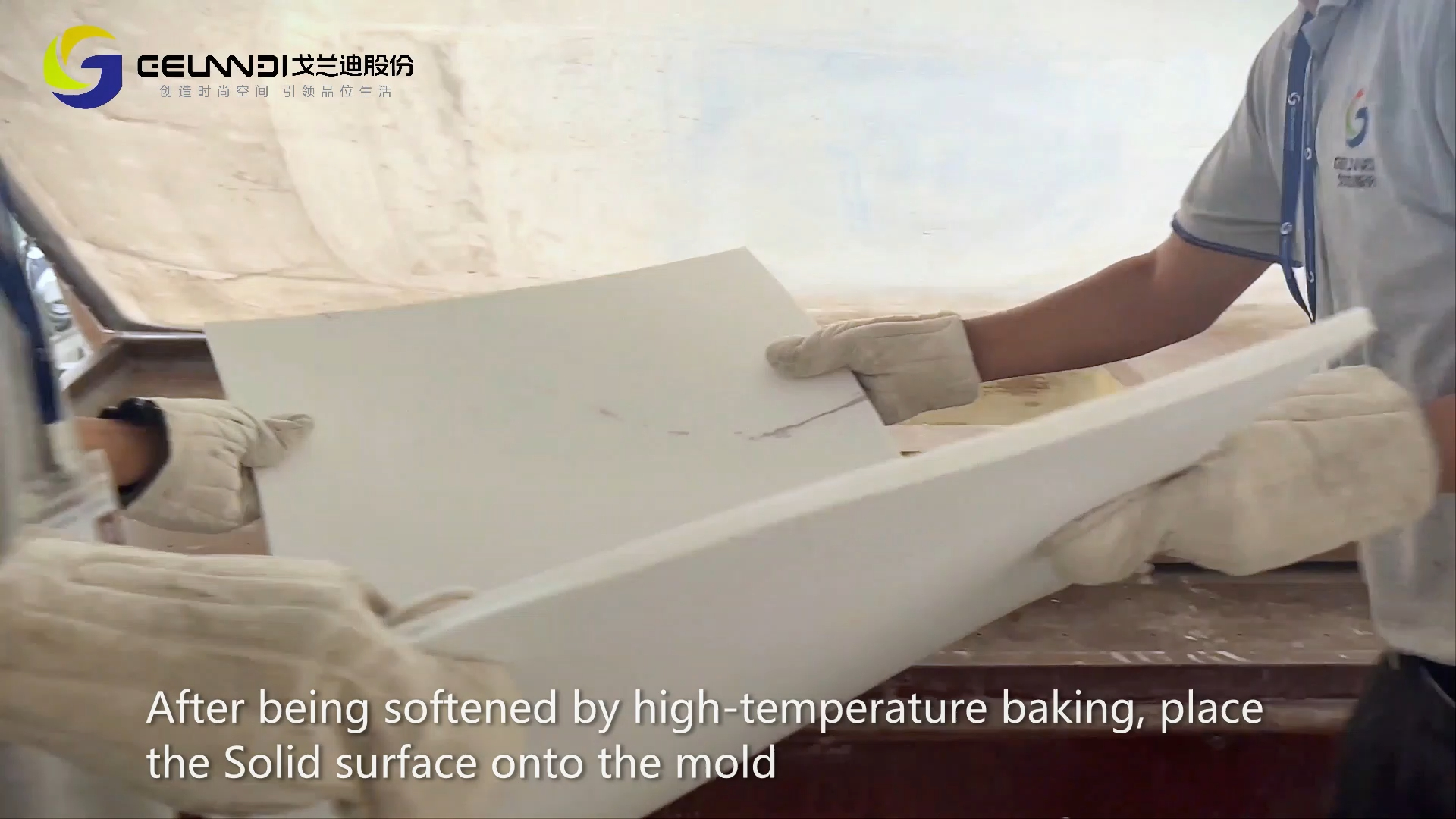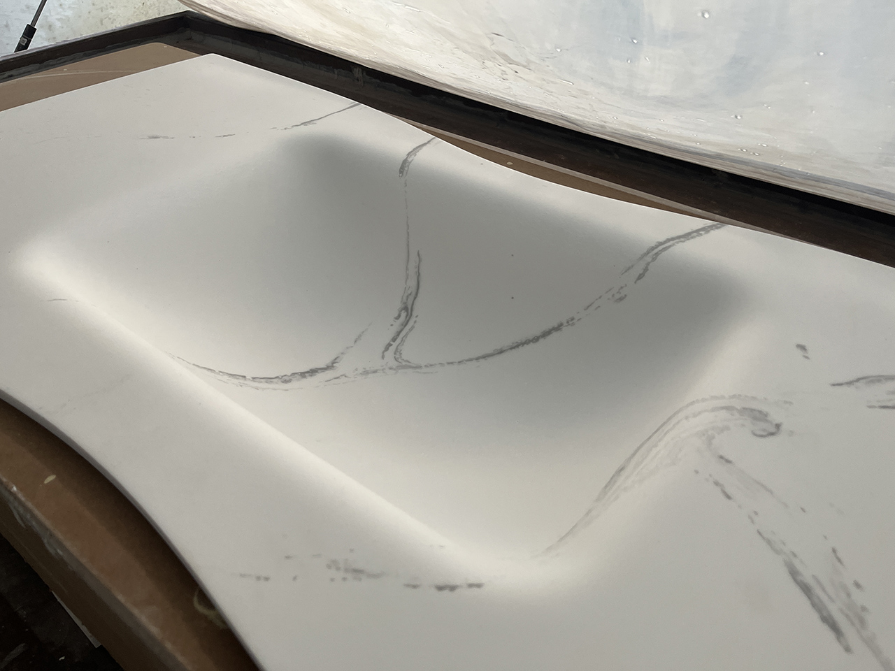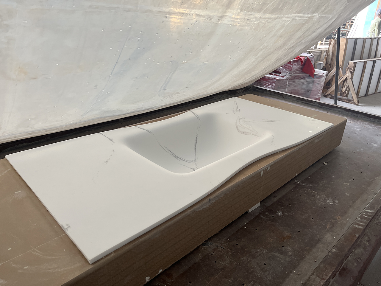 Place the solid surface slabs on the mold, vacuum it, and the solid surface slabs begin to bend and takes shape to form an integrated basin.