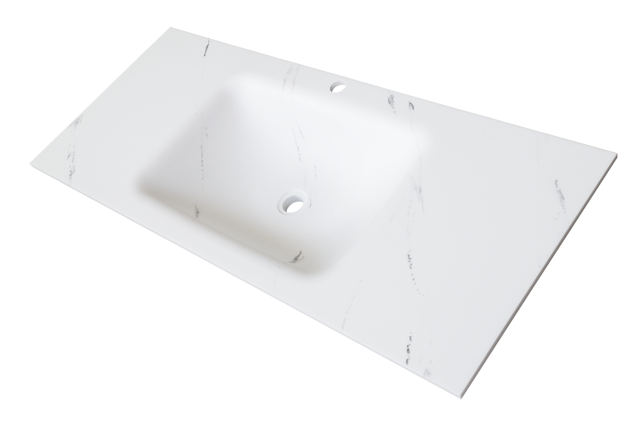 This basin is made of solid surface slabs.First,the solid surface slab is softened by high-temperature baking,then placed on the mold.Vacuum it, and the integral basin will take shape.