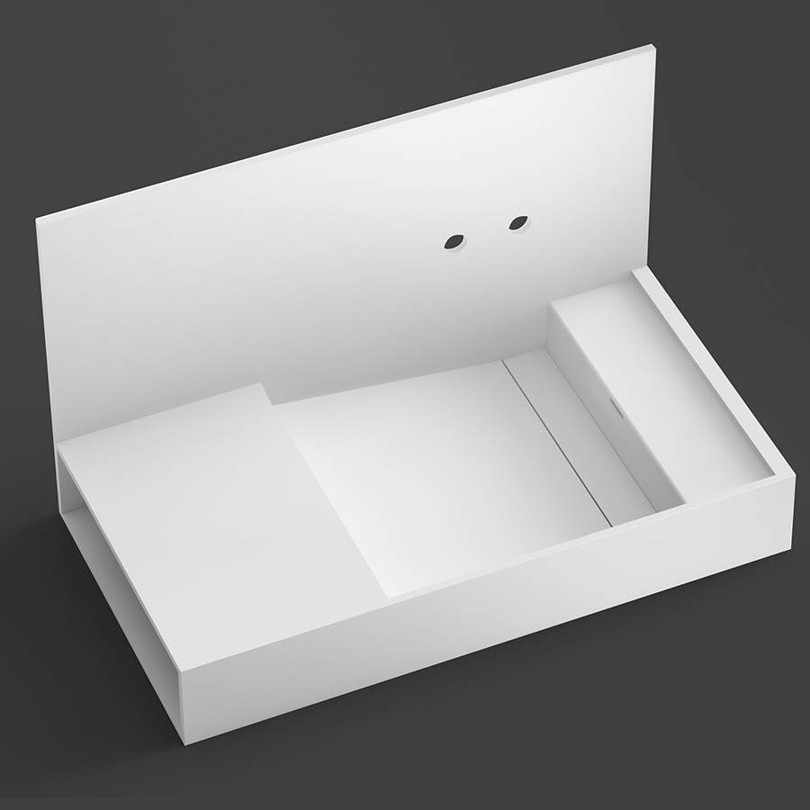 The backboard of this solid surface basin is elongated and seamlessly integrated with the basin during later stages, giving it a unified appearance. It can prevent water from splashing onto the wall. The design of the basin is very distinctive, with a sloping and concealed drainage system at the bottom.On the left side, there is a square-shaped storage area built in, where you can place various toiletries, making it highly functional.