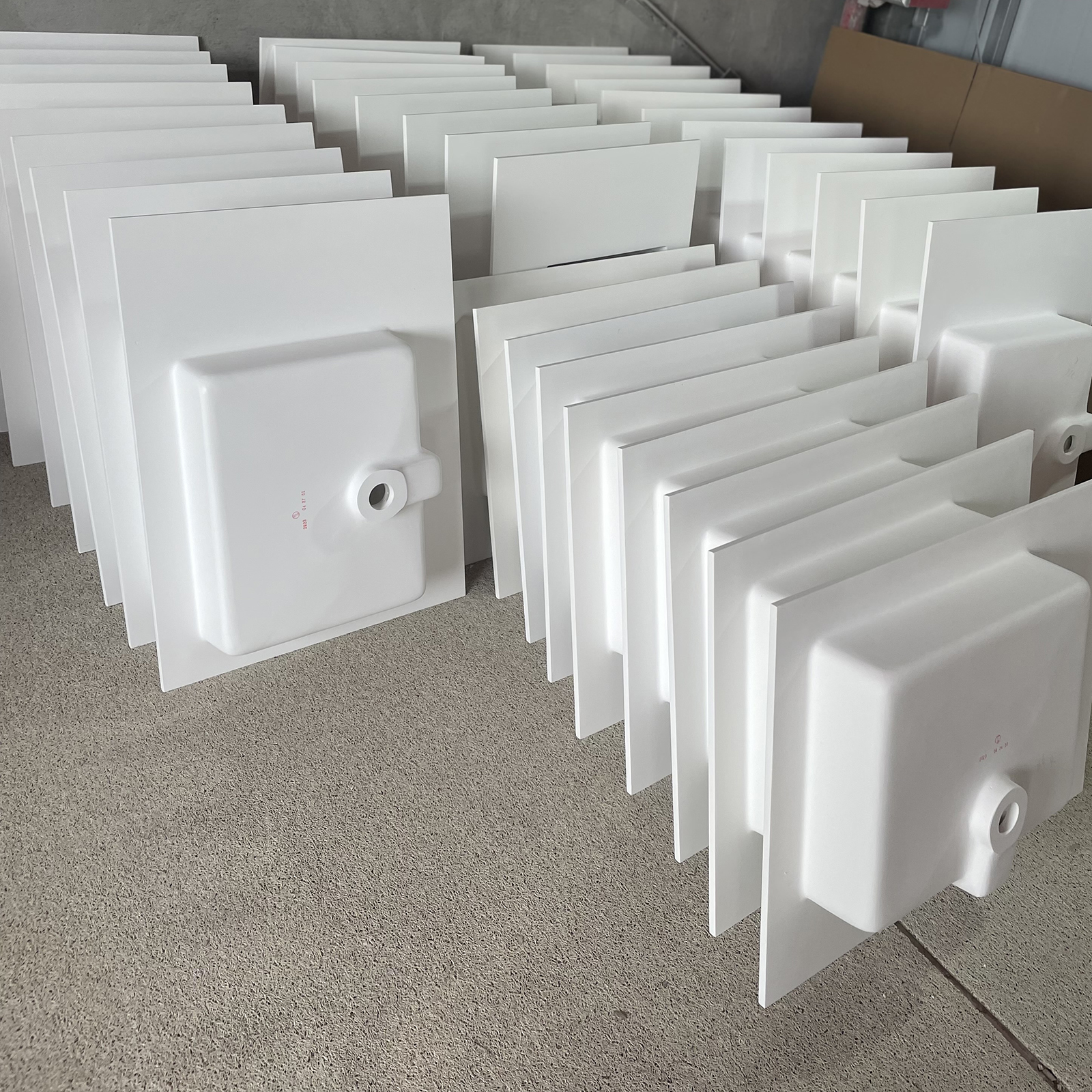 Gelandy Pure Acrylic Solid Surface Basin ST-MET-5121 is designed as a single sink with an extended countertop. The number of sink bowls and the length of the countertop can be customized according to preferences. Gelandy Pure Acrylic Solid Surface Basins are crafted using a precise mixture and pouring process of MMA (Methyl Methacrylate) and high-quality aluminum hydroxide powder. With a Vickers hardness of over 60, this basin exhibits excellent attributes such as resistance to thermal shocks, impact, stains, discoloration, and is easy to maintain.