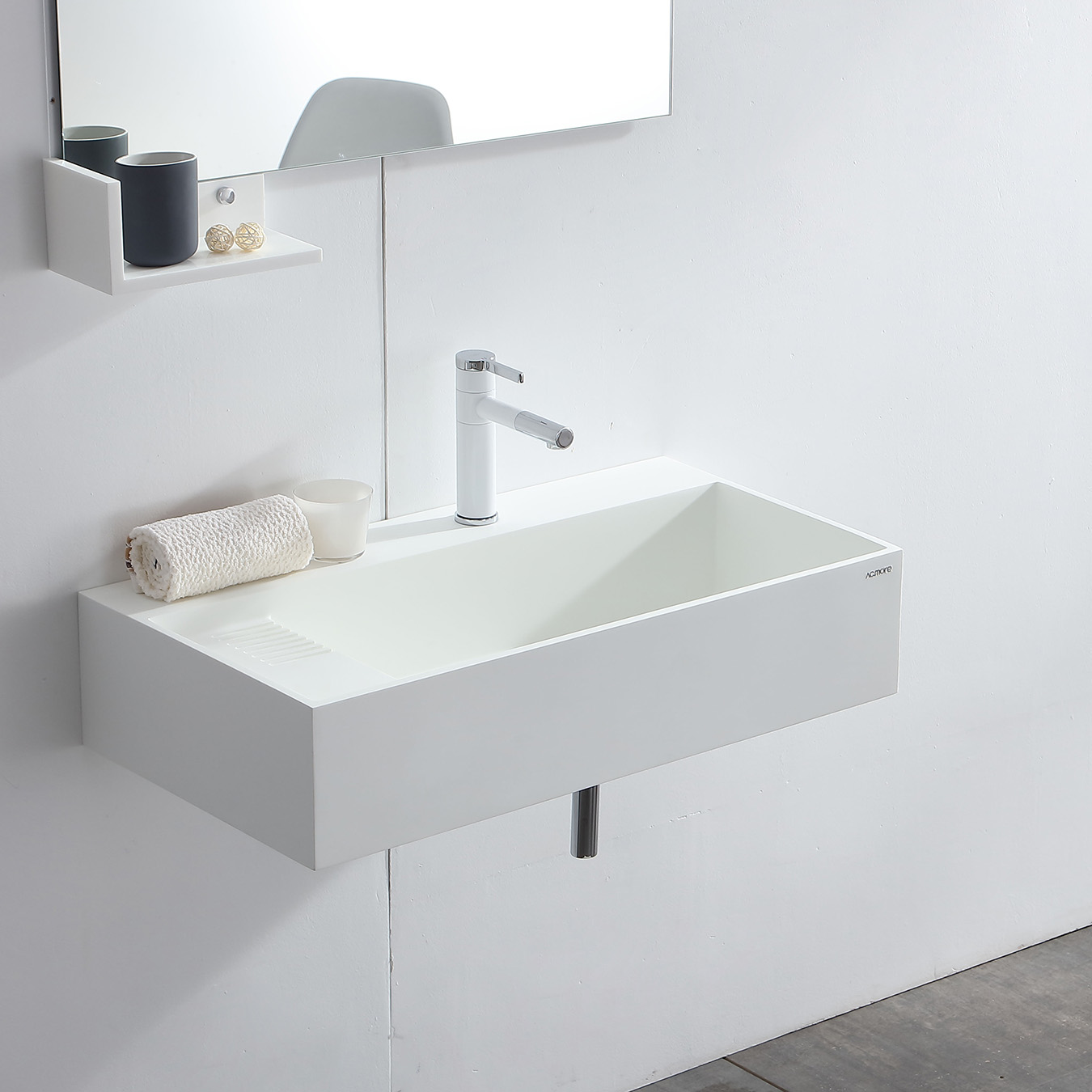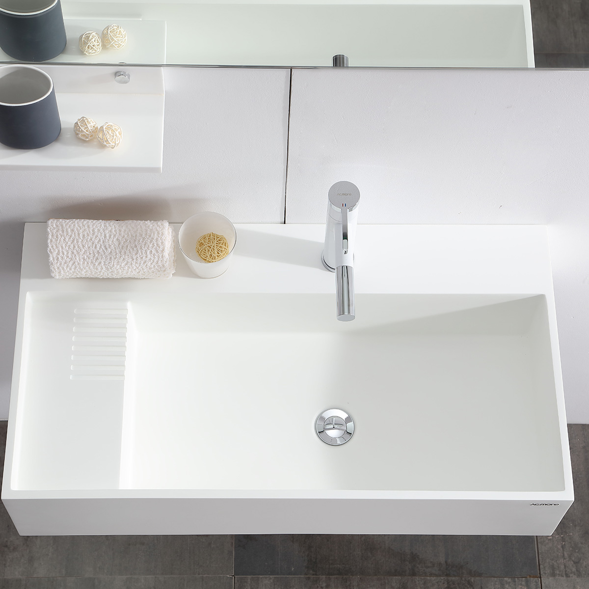 The Gelandy solid surface basin 3050 is a integrated wash basin.This basin can be placed on top of a cabinet or customized as a wall-hung basin. The wall-hung version has a longer edge compared to the countertop version.