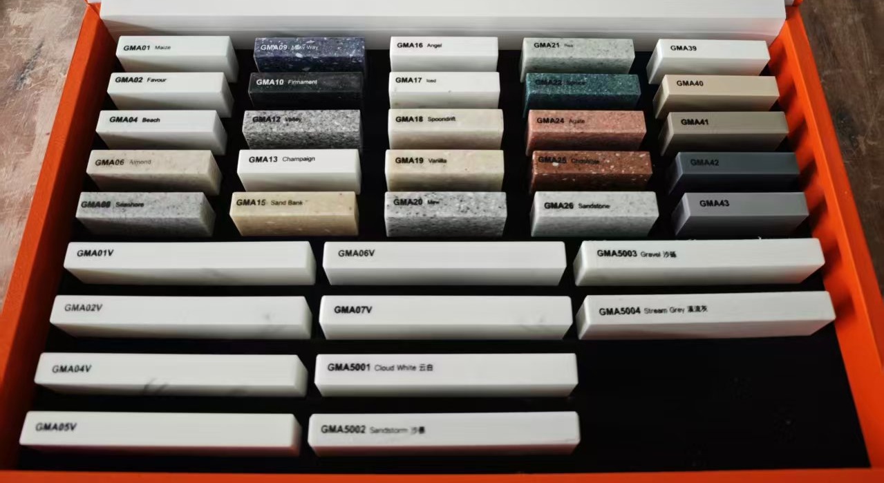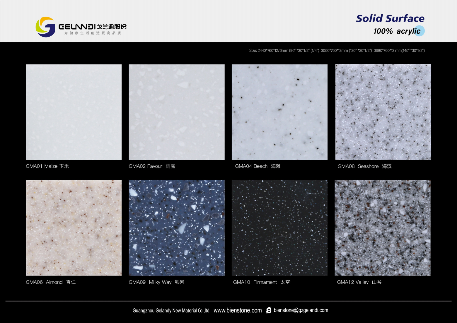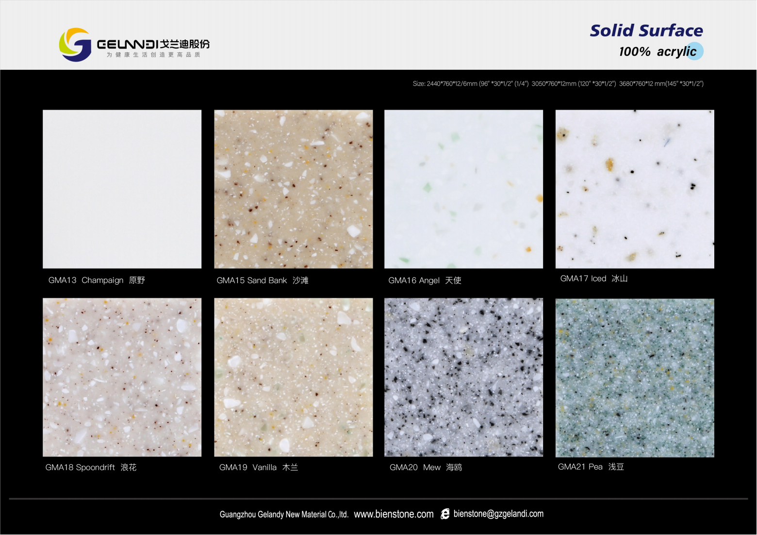 GELANDY pure acrylic solid surface is made of polymathic methacrylate (PMMA) as substrate and high-quality aluminum hydroxide powder. It has excellent mechanical properties and weather resistance, stain resistance, water resistance, yellowing resistance and UV resistance.