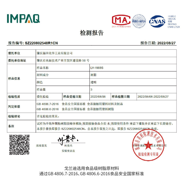 The resin raw materials used by Gelandy are SGS certified and comply with the GB 4806.7-2016 and GB 4806.6-2016 national standards for food safety.