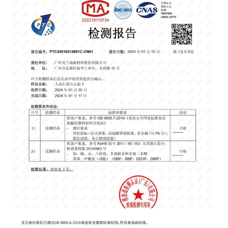 Gelandy quartz sand raw materials have passed the GB 4806.7-2016 national standard for food safety.