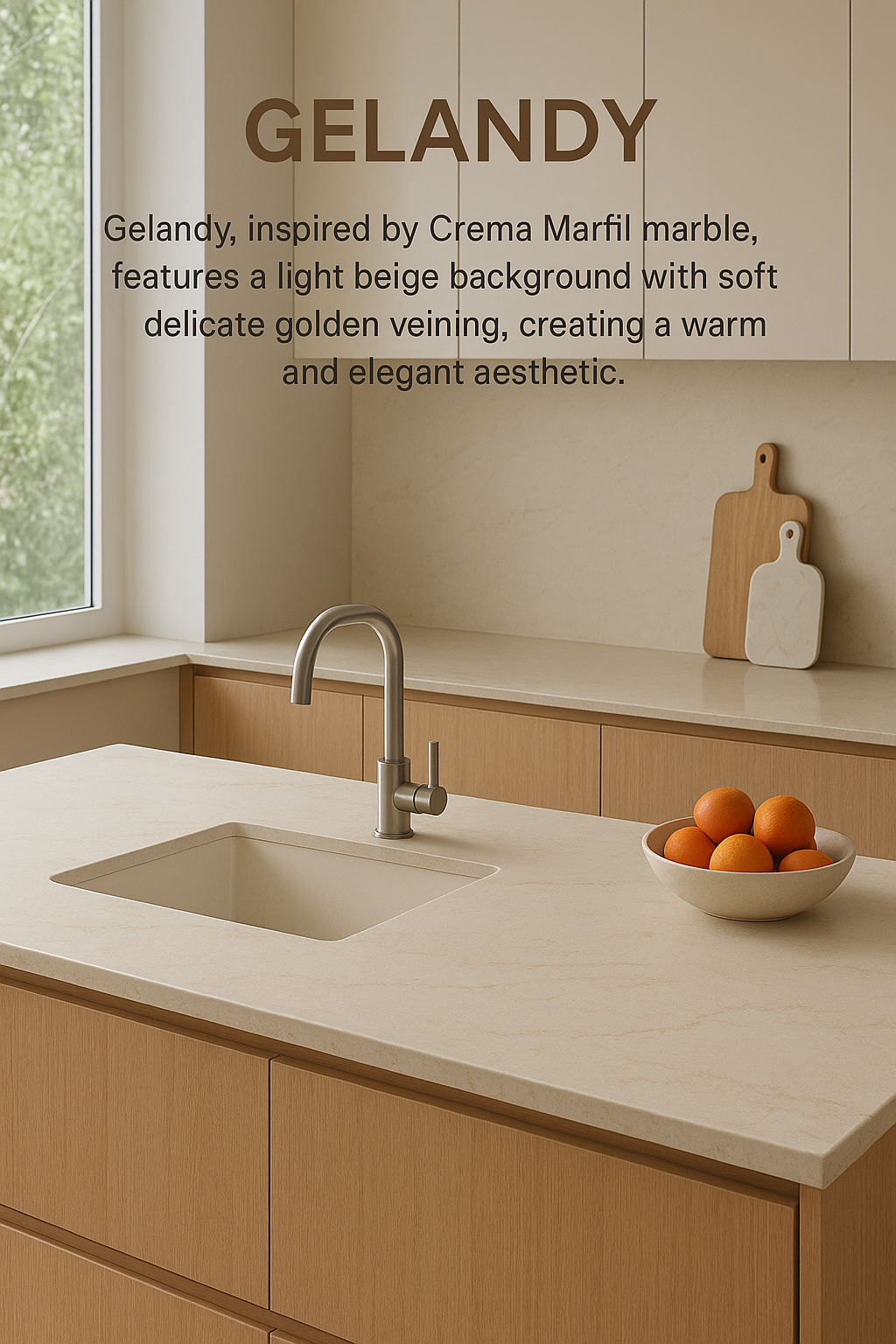 GELANDY quartz stone Crema Marfil draws its inspiration from the timeless beauty of Crema Marfil, a prestigious natural marble originating from Greece. Renowned for its soft elegance and warm aesthetic, Crema Marfil has long been a symbol of refined taste in luxury architecture and interior design. GELANDY captures this natural charm while enhancing it with the durability, consistency, and practicality of engineered quartz.