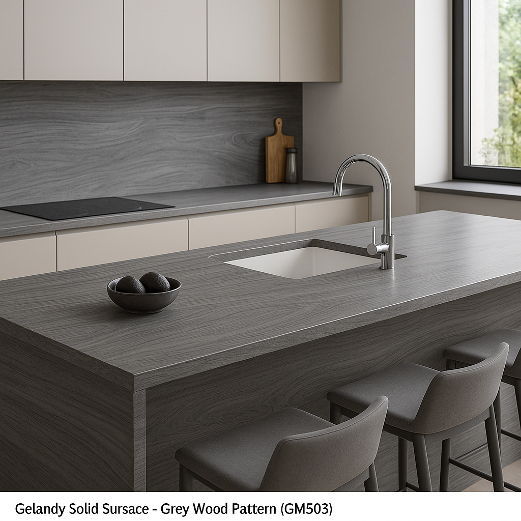 The Gelandy Solid Surface in Grey Wood Pattern (GMS03) offers a seamless blend of nature-inspired design and high-performance material. This surface showcases an pattern that mimics natural grey wood, with fluid, organic streaks and subtle tonal variation. The texture evokes the calm sophistication of aged wood, making it ideal for interior spaces seeking a warm, modern, and organic aesthetic.
