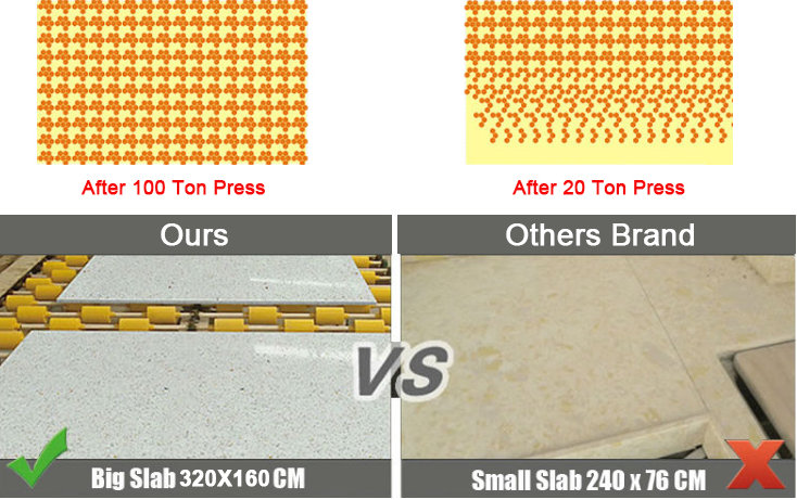 Small slabs normally size 240x76cm,although it can reduce the material waste,but one set countertop with such many joint scad,will lack of aesthetic