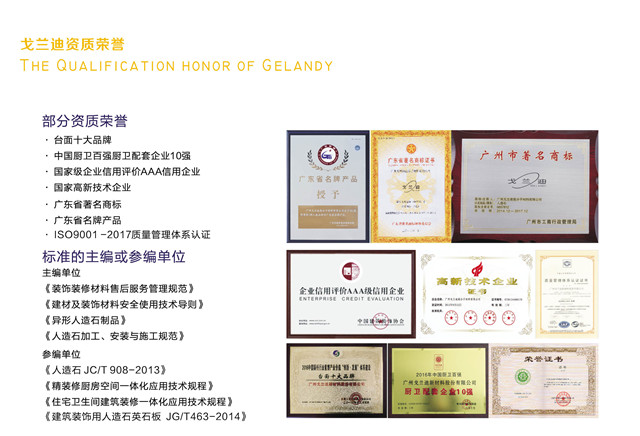 En los últimos 18 años, Gelandy siempre se ha adherido a la misión de " ser un proveedor confiable de encimeras en China " y ha persistido en la estrategia de desarrollo de la marca. Ha ganado un monumento después de la construcción de la marca. Al mismo tiempo, puede participar en la edición de los nueve estándares nacionales , lo que es una especie de reconocimiento y apoyo para Gelandy.
