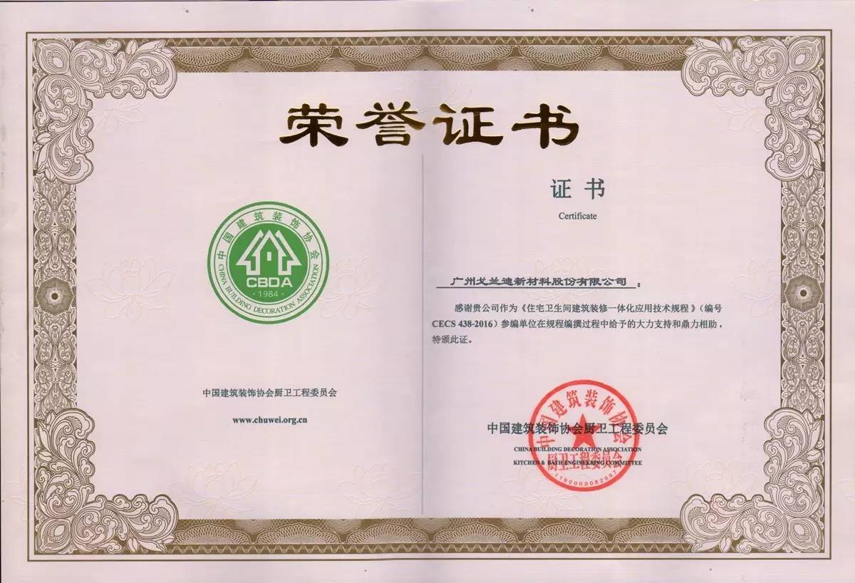 "Décoration de salle de bain résidentielle application intégrée des règlements techniques" mis en œuvre le 1er septembre 2016. Les travaux de préparation depuis le début du 25 octobre 2013, édités par le comité d'ingénierie de cuisine de l'Association chinoise de décoration de bâtiment, ont eu l'honneur de compiler les règles de Gelandy.