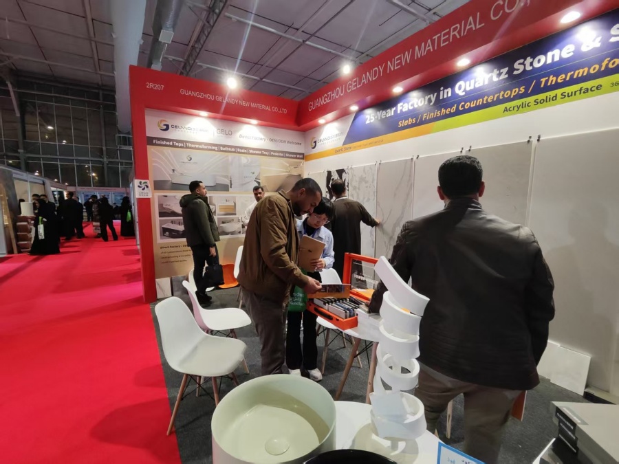 最大のハイライトの一つは、GELANDYのクォーツストーンとソリッドサーフェスカラーのコレクションで、現地市場で強い存在感を示しました。明るく目を引く色調と、天然石にインスピレーションを得た革新的なパターンを特徴とする多くのデザインが大きな注目を集めました。多くの来場者から「本当に天然石ですか?」と尋ねられるほどで、GELANDYの高度な製造技術によって実現された高いリアリティと美的魅力を実証しました。