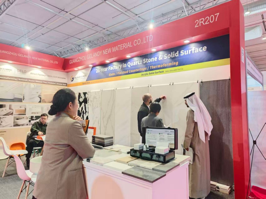 展示会において、GELANDYはクォーツストーンスラブ、ソリッドサーフェスマテリアル、ソリッドサーフェス洗面器など、幅広いサーフェス製品を展示しました。展示を通して、GELANDYの素材イノベーション、色彩開発、そして住宅・商業空間向けの統合サーフェスソリューションにおける強みが際立っていました。