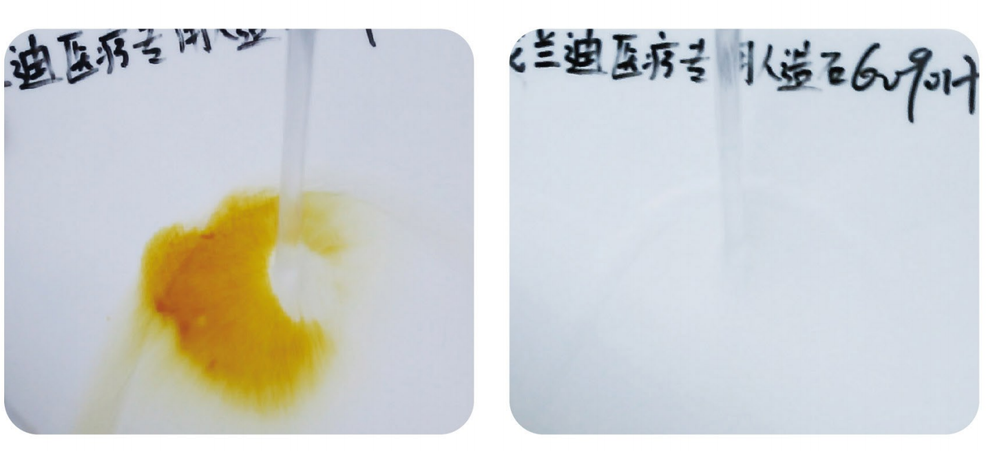 요오드포어를 Gelandy 의료용 고체 표면 샘플에 떨어뜨렸고, 24시간 후 요오드포어가 확산되어 건조되어 조리대에 부착되었습니다. 물로 헹군 후 걸레로 닦았더니 요오드포어가 깨끗해졌고 조리대에 흔적이 남지 않았습니다.