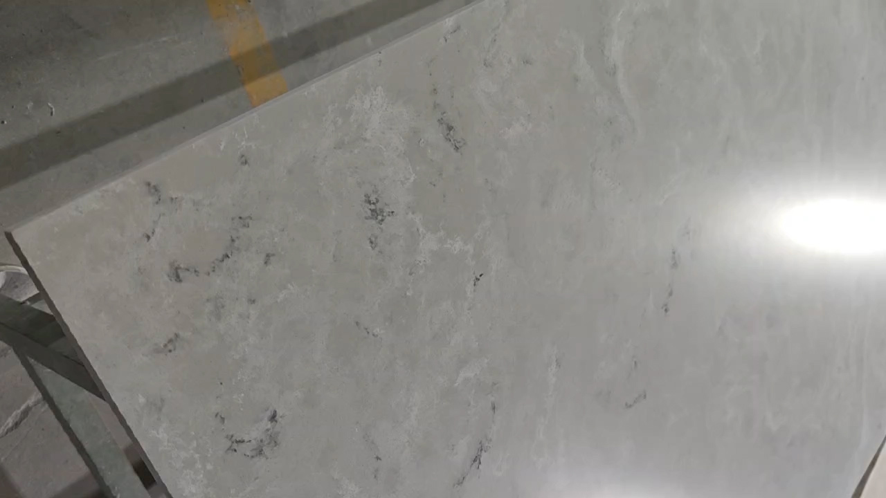겔란디의 솔리드 서피스 베인 "GYH009 인터스텔라"는 밝은 회색 바탕에 회색과 흰색 베인이 특징으로, 자연석의 모습을 흉내냈습니다.