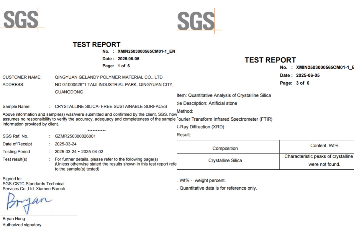 GELANDY kuarza sifar silika dan permukaan pepejal disertakan dengan laporan pihak ketiga bebas yang mengesahkan: