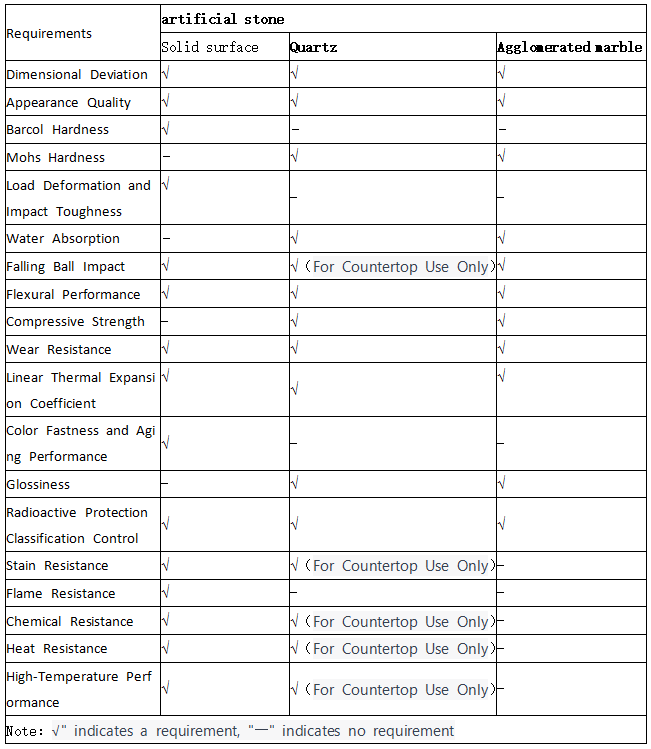 Pada masa ini, piawaian industri lazim untuk industri permukaan pepejal China ialah "JC/T 908-2013 Artificial Stone" di bawah Industri Bahan Binaan Republik Rakyat China. Dalam artikel ini, kami membentangkan petikan yang berkaitan dengan piawaian untuk bahan permukaan pepejal batu tiruan.