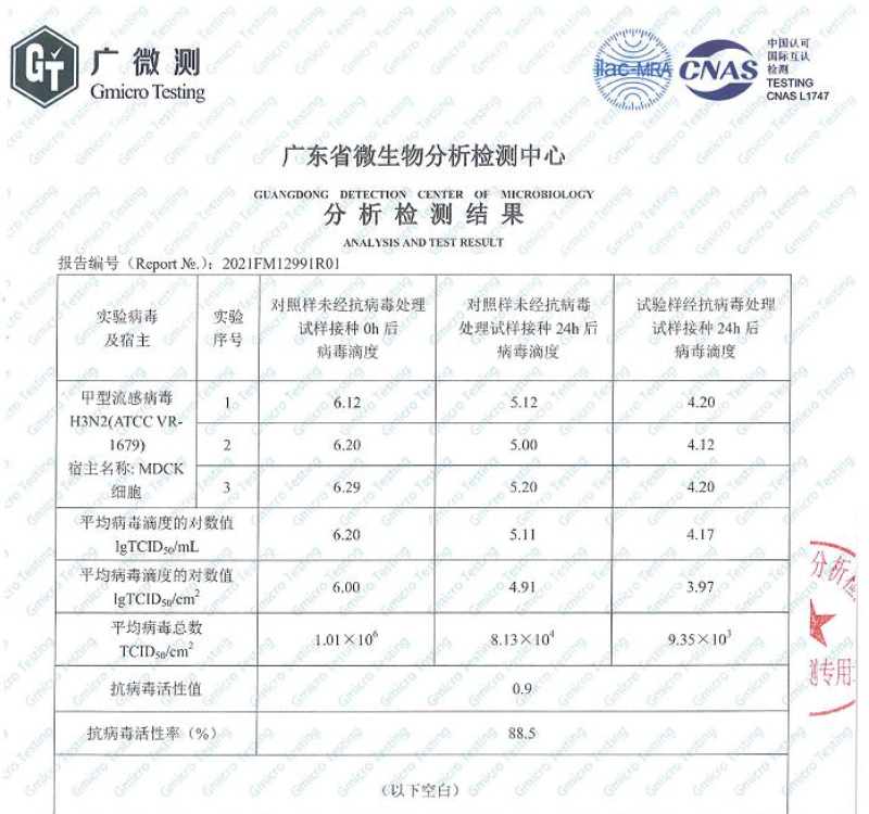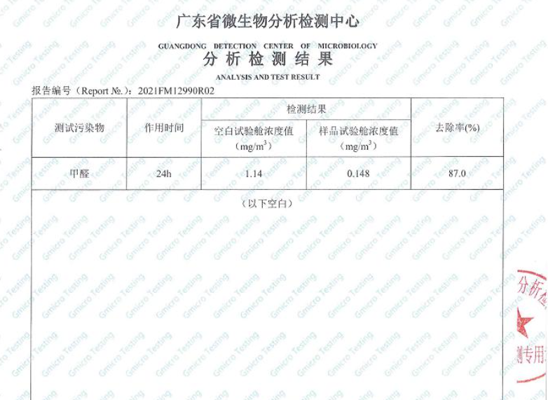 More than 99% of the antibacterial ratio.87% of the Formaldehyde removal ratio.Anti-influenza virus function.