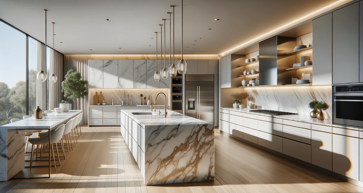 | Calacatta Borghini Gold | Branco marfim com veios dourados e cinza quente. | Ilha de cozinha ultra-premium e recepção de hotel |