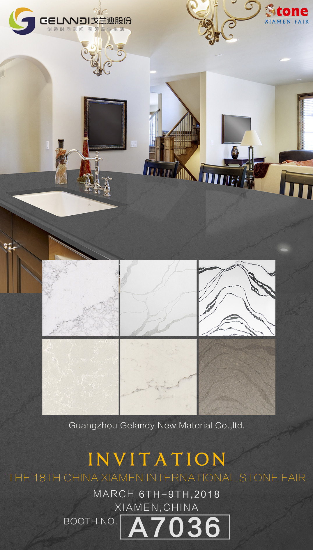 O estande NO.A7036, Gelandi está esperando por você na 18ª Feira Internacional de Pedra de Xiamen, China