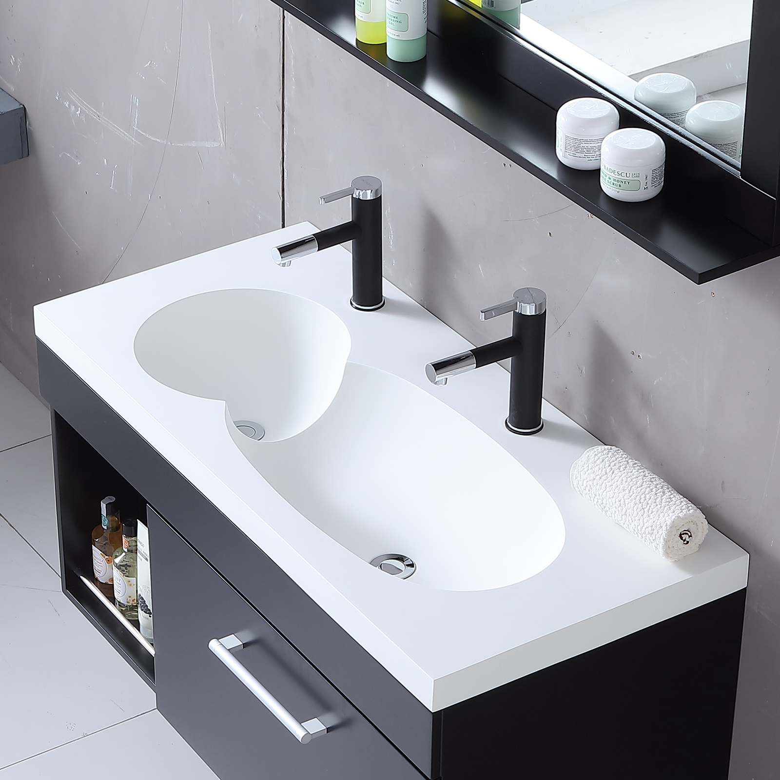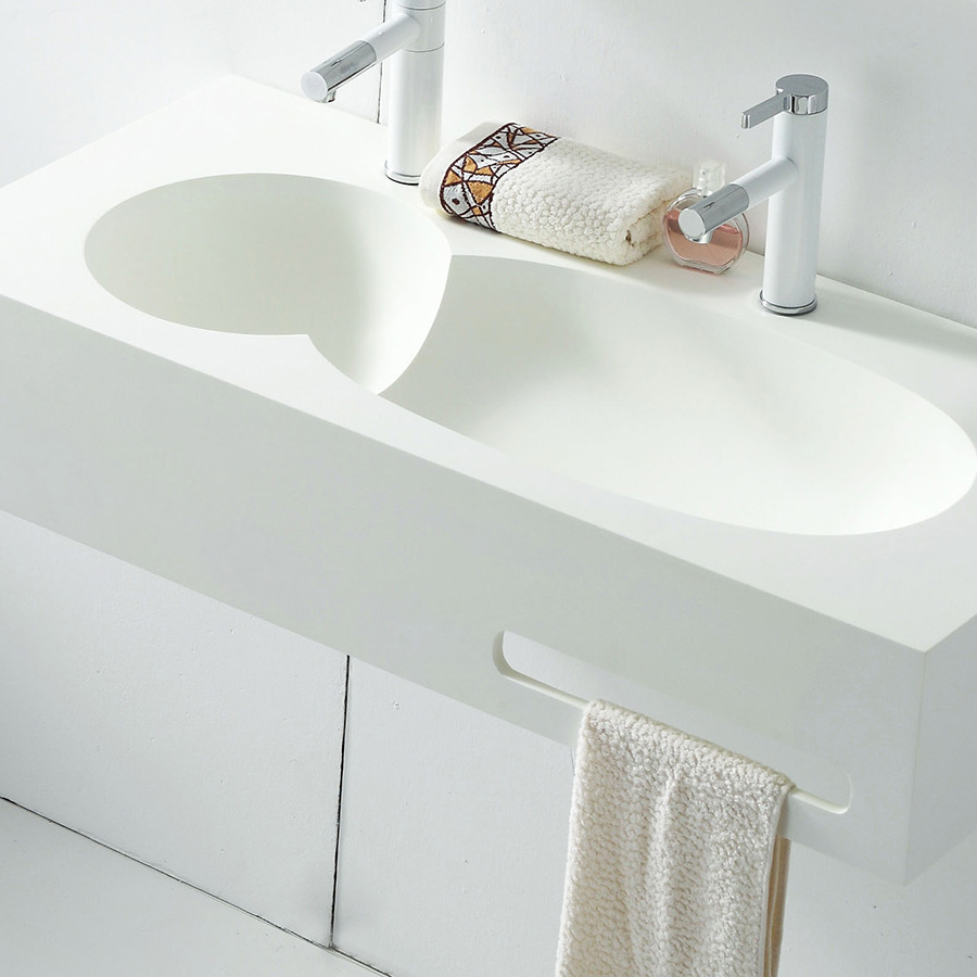 Ang Gelandy solid surface basin 208 ay isang pinagsamang washbasin na may double sink na disenyo. Nagtatampok ito ng dalawang konektadong lababo, isang mahaba at isang maikli, na nagdaragdag ng kasiyahan at kakaiba sa disenyo.